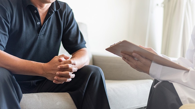A man sitting on a sofa with hands clasped during a wellness consultation, facing a healthcare provider holding a clipboard, symbolizing a confidential and professional discussion about men's health.